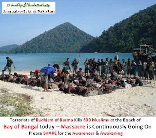 FAKE: This is another image (below) which was posted online, this time with an imprint of Jamaat-e-Islami on the top left . It reads “Terrorists of Budhism of Burma kills 500 Muslims”.